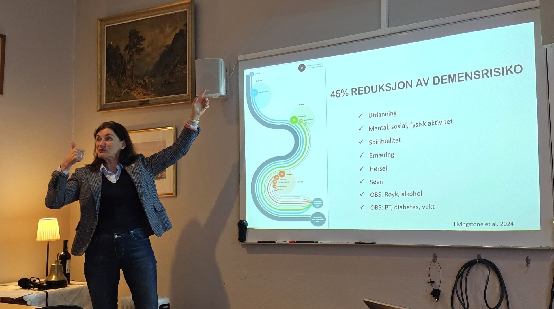 Foredraget tok også opp pårørendebelastning, spesielt for kvinner som ofte står alene i omsorgsrollen, samt betydningen av søvn, livsmening og sammenhengen mellom demens og andre sykdommer.